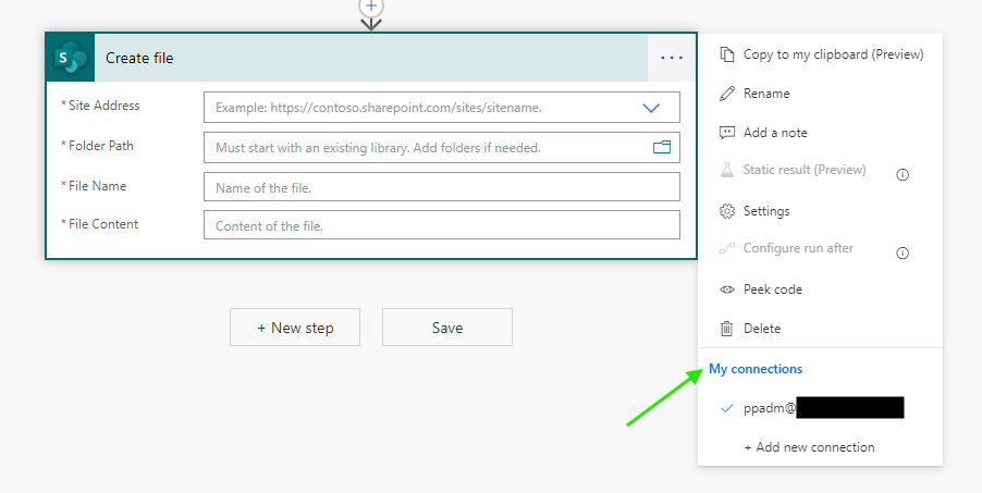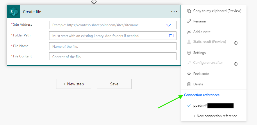 In the screenshot below, you can see that, unlike the previous screenshot where it says "My connections" (indicating that the SharePoint action is directly linked to a connection because the flow is outside of a solution), it now says "Connection references." This is because the flow is inside a solution.